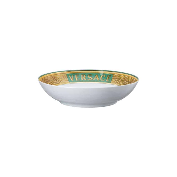 This luxury deep porcelain plate features Versace’s iconic Green Coin design. At 22 cm in diameter, it is ideal for soup and stylish gourmet servings. A must-have for elegant, statement tableware collections.